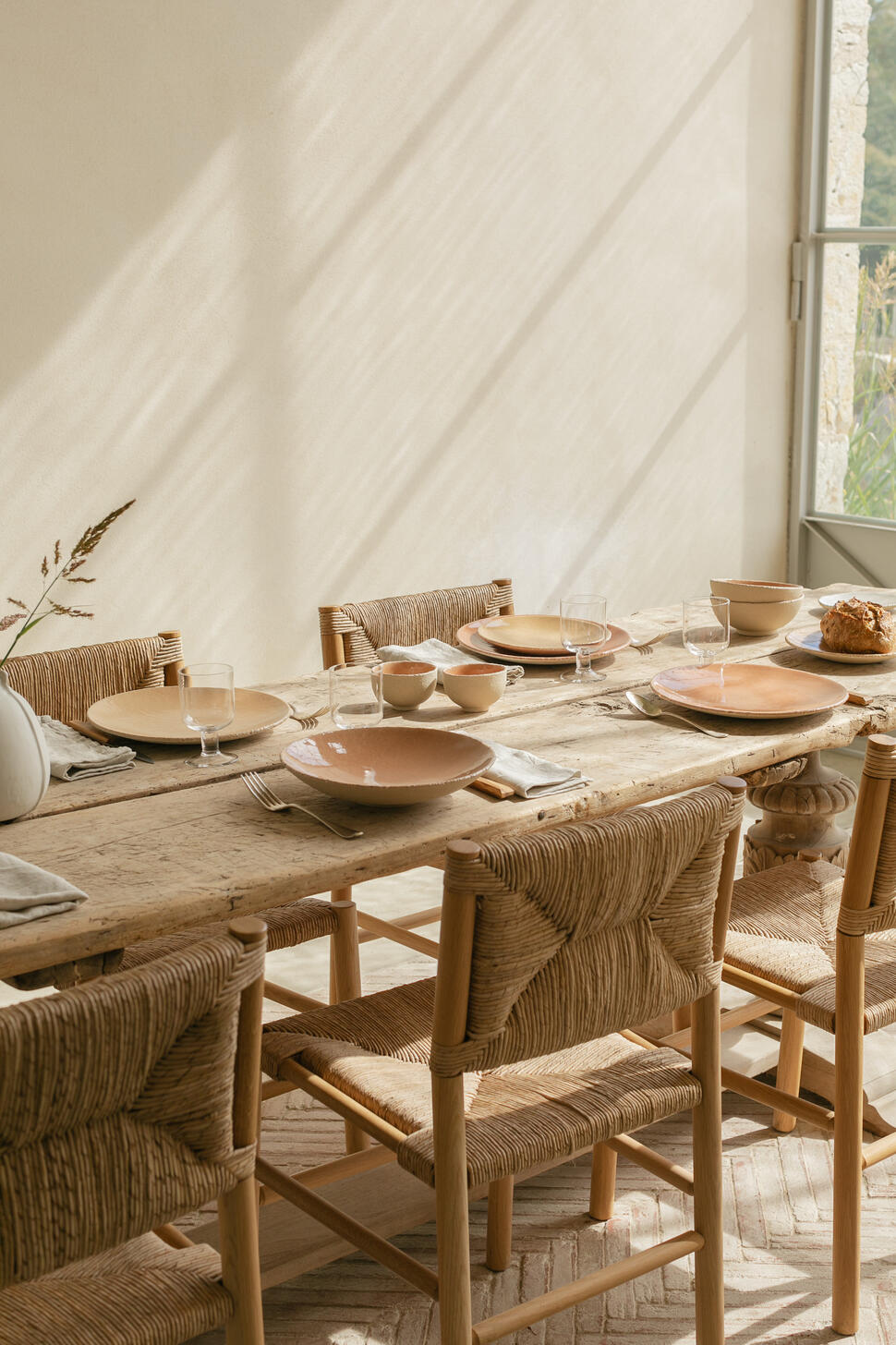 Round shapes like the sun. Raw finishes in chamotte like the earth of its origins.