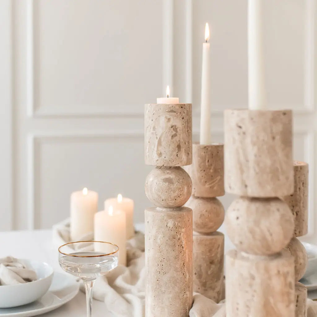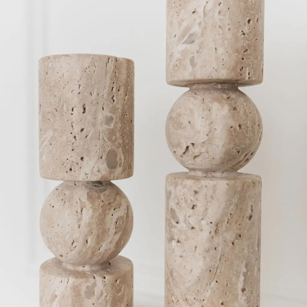 Designed to enhance your tables or mantelpieces, these travertine candlesticks combine raw materials with versatile use. Their slender silhouette in natural ivory stone blends seamlessly into both contemporary and classic settings.
