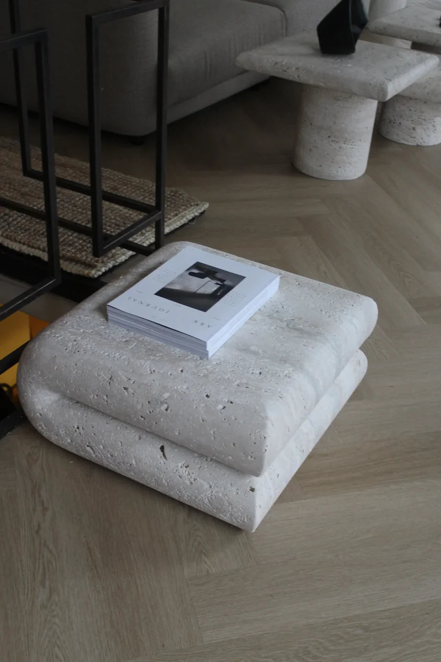 The Rudolph sofa is available as a freestanding sofa, two-seater, three-seater, and a single sofa, with wooden side tables and marble tops. Freestanding side tables and center tables complete the collection.