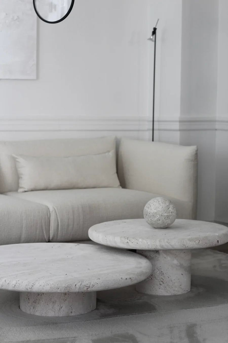The Rudolph sofa is available as a freestanding sofa, two-seater, three-seater, and a single sofa, with wooden side tables and marble tops. Freestanding side tables and center tables complete the collection.