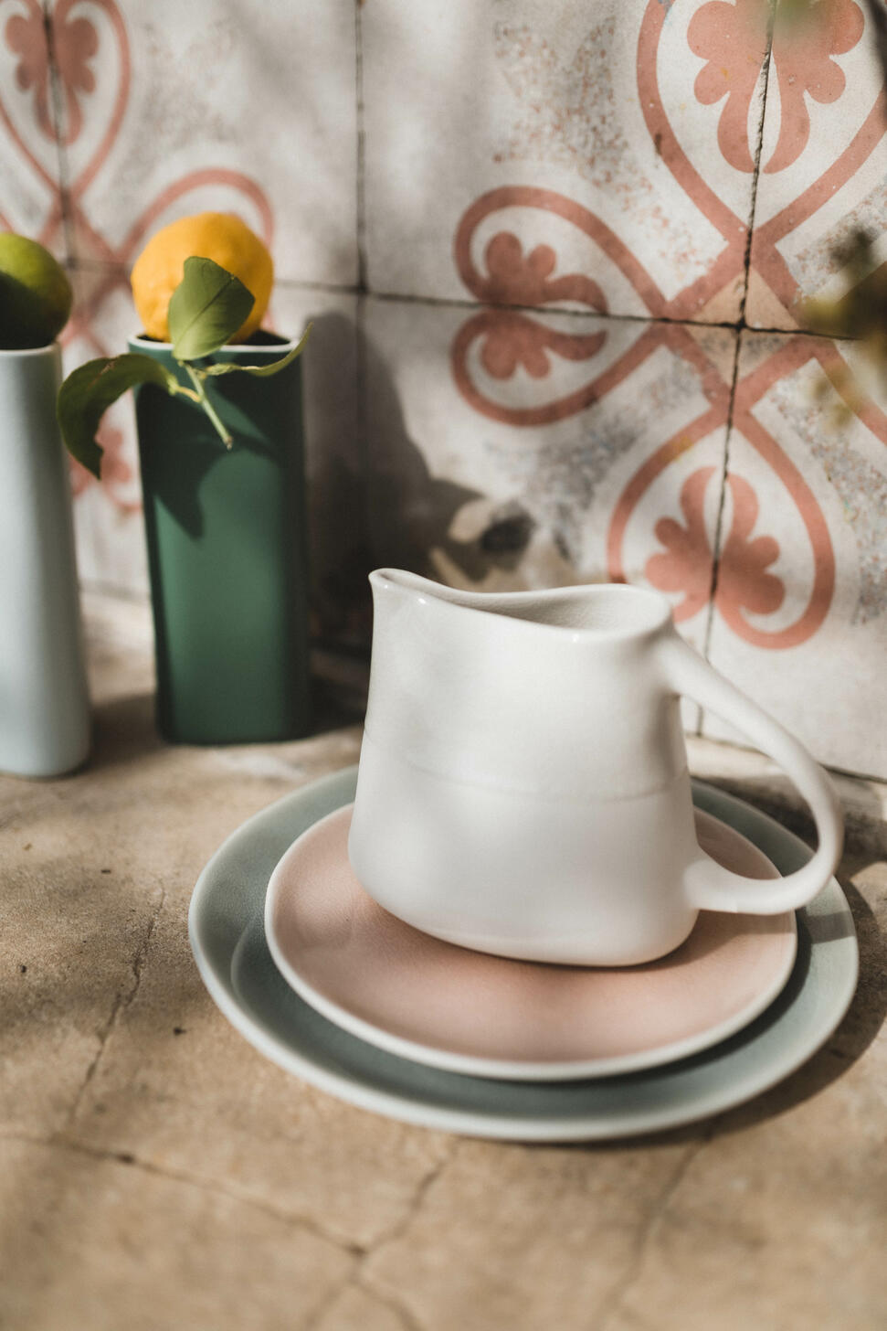 L-vormig bord van perfect-imperfect keramiek, met onregelmatige lijnen. Organische en delicate vorm, sporen van de hand van de keramist.
