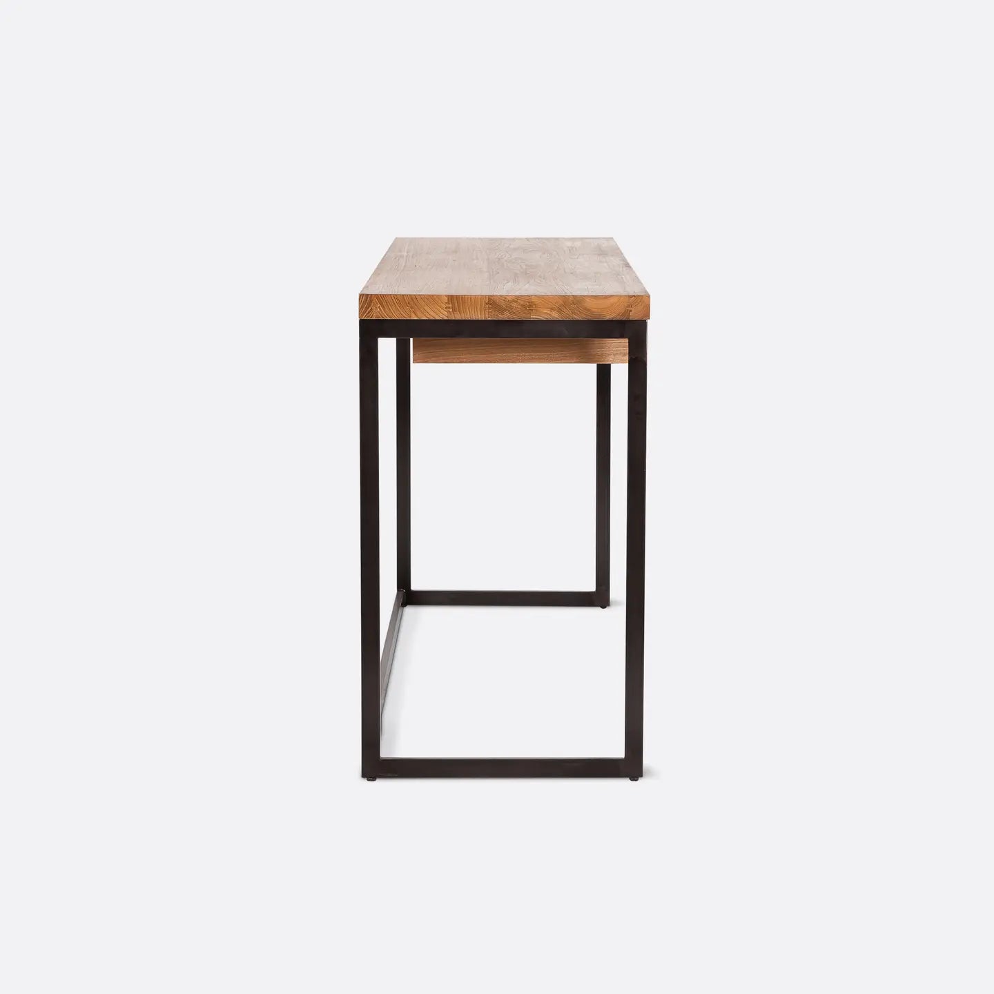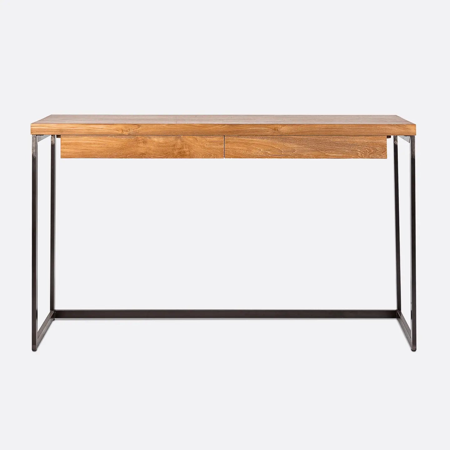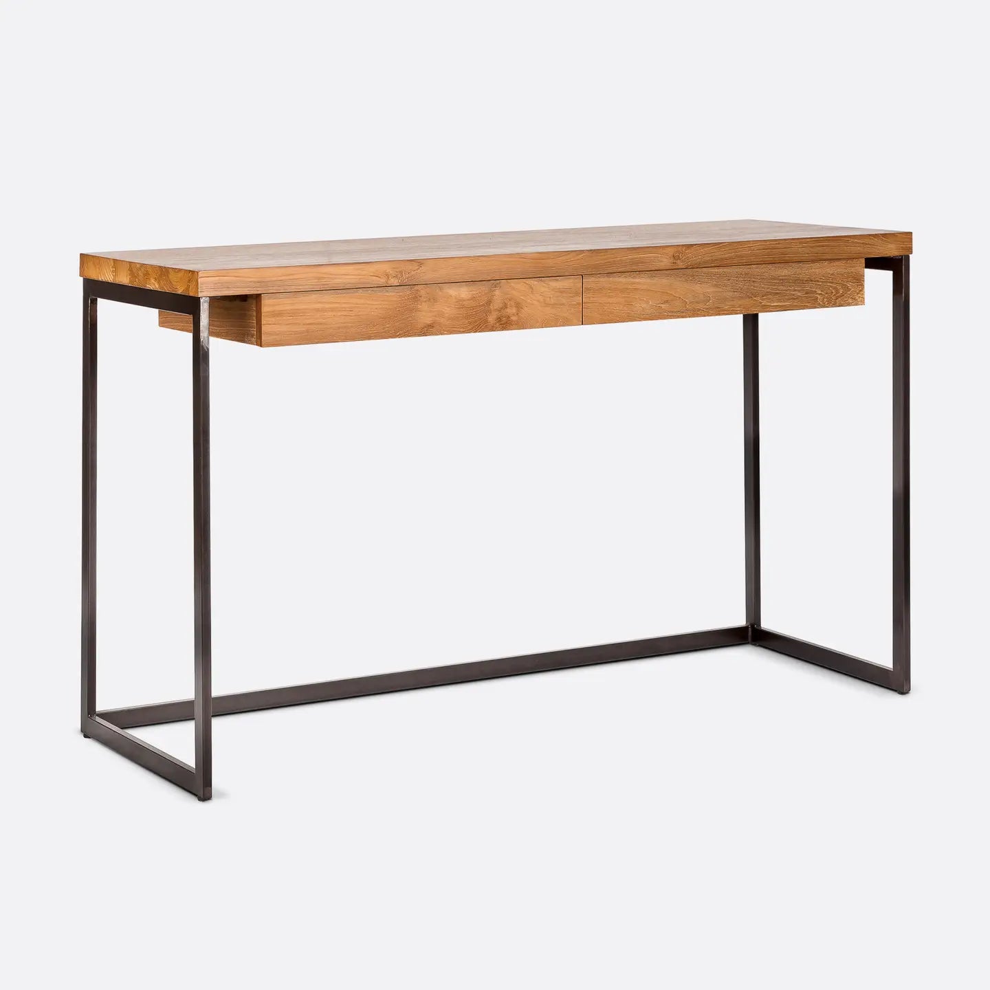 Issu de la collection éponyme, le bureau Three allie structure minimaliste en fer noir et plateau en teck recyclé pour créer une pièce empreinte de graphisme et de chaleur. Deux tiroirs bas centrés offrent un espace de rangement discret, tout en maintenant la promesse d’ergonomie et de la légèreté.