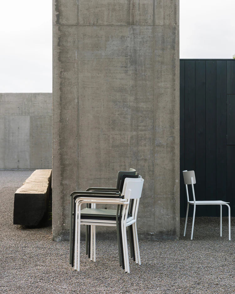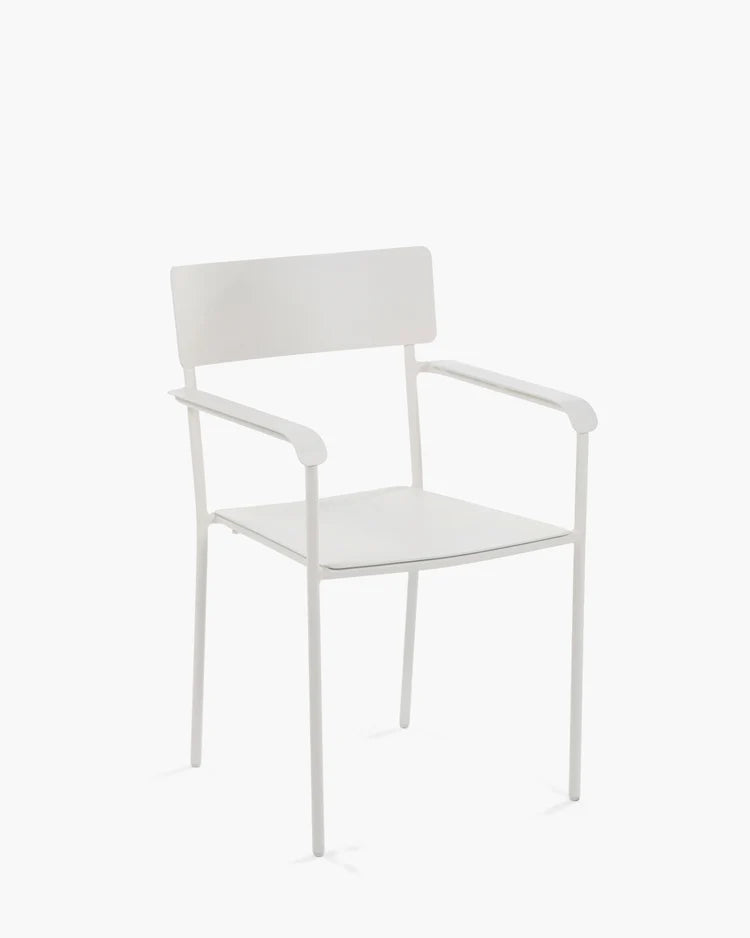 Les chaises de salle à manger en acier August avec accoudoirs font partie de la collection de mobilier de jardin minimaliste conçue par Vincent Van Duysen pour le projet de l'hôtel August à Anvers.
