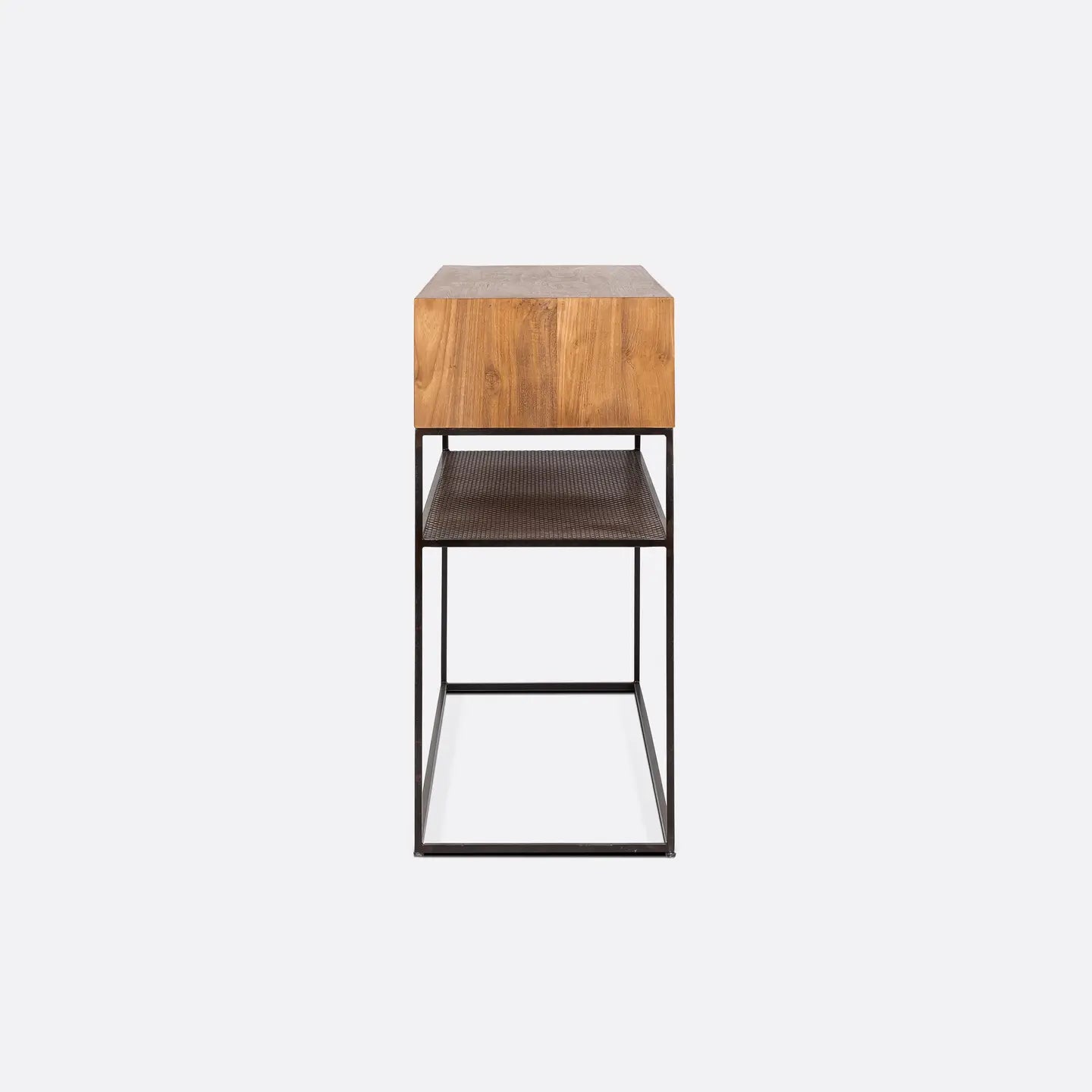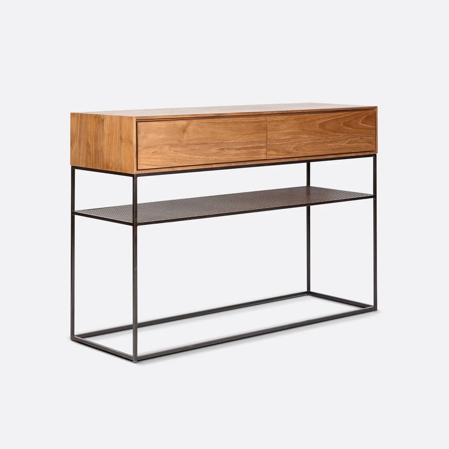 Cette version revisitée de la console ONETWO allie élégance brute et fonctionnalité. Sa structure en fer massif au profil carré affirme une esthétique industrielle affirmée, tandis qu’une étagère intermédiaire en tôle perforée ajoute un espace de rangement pratique et aérien. Le large tiroir en teck, travaillé avec un rebord affiné d’un centimètre, confère légèreté et finesse au design. À l’intérieur, deux compartiments spacieux équipés du système push-to-open & soft close assurent une ouverture fluide et silencieuse.